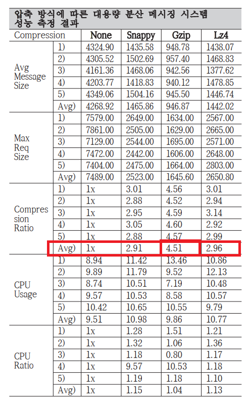 3가지 압축방식을 지원하는데 압축에 따라서 메시징 성능에 영향을 끼친다.