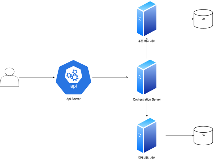 transaction이 필요한 서버 중간에 orchestration Server가 위치한다.