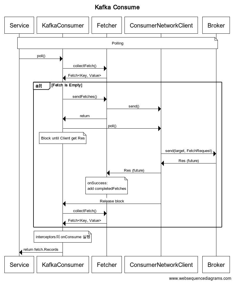 - KafkaConsumer는 ConsumerNetworkClient에게 poll()을 호출하여, 응답을 받을 때 까지 Block
