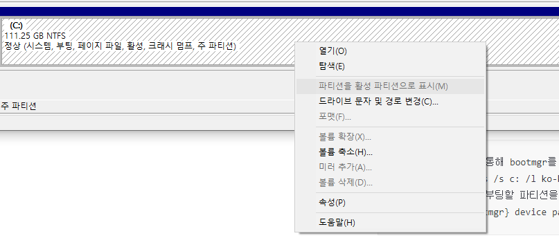 지금은 이미 활성해서 회색이지만, 파티션을 활성 파티션으로 표시한다.