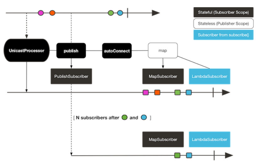 1. publish()를 통한 생성: 동적으로 여러 구독자들의 demand를 모니터링 하며, 하나라도 구독자가 pending된다면, 즉시 소스로의 요청을 중단한다.