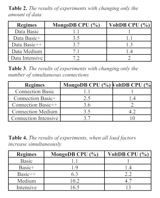 기본적인 CPU 사용량은 VoltDB가 더 효율적이며, transaction 처리 성능에 큰 이점을 가진다.