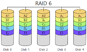 RAID 5 + 안정성 패러티 디스크를 2개 사용해서 최대 2개의 하드가 동시에 나간걸 복구 할 수 있다. 하드 가용량은 (N-2)/N * 100% |