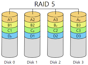 안정성 + 속도 패러티를 사용한다. 3개 이상의 디스크가 있어야 구성 가능하다. 이는 자신을 제외한 어느 한 디스크에 패러티를 저장하여 하드가 오류일 때 나머지 하드+패러티 정보를 사용해서 데이터를 복구한다. 하드 가용량은 (N-1)/N * 100% |